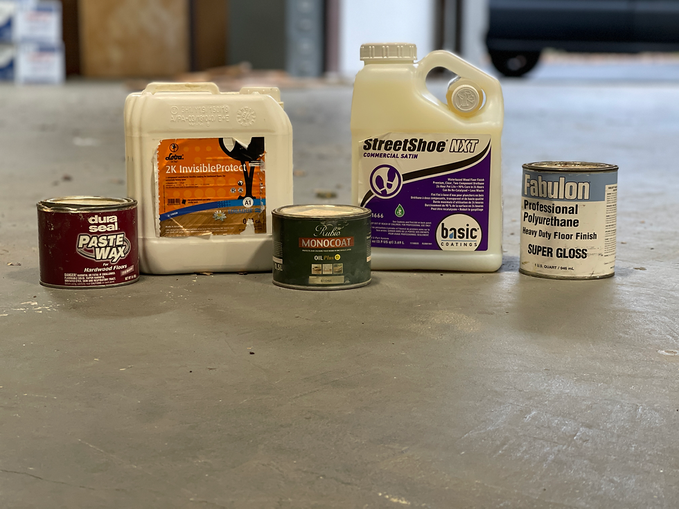 Waxes: Used mostly in the 60's and 70's and rarely used any more. The newer finishes are much more durable/scratch and water resistant. This finish is also difficult to remove, once used. If your floor is waxed, the only options are to re-wax or sand it off completely. It is also a very slippery finish once applied. One positive is that the touch ups are easier than most other finishes and has a very low odor.